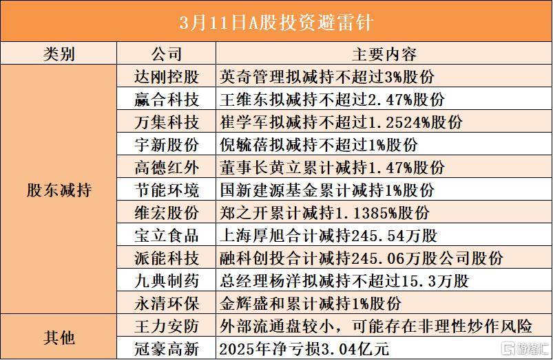 达刚控股股东(dong)英奇管理拟减持不(bu)超过3%股份;赢合科技股东(dong)王维东(dong)拟减持不(bu)超过2.47%股份;万集科技股东(dong)崔学军拟减持不(bu)超过1.2524%股份;宇新股份股东(dong)倪毓蓓拟减持不(bu)超过1%股份;高德红外董事长黄(huang)立累计减持1.47%股份;节能情况股东(dong)国新建源(yuan)基金累计减持1%股份;王力安防透露表现内部流畅盘较小,可能存在非理性炒作风险(xian);冠豪高新2025年净吃亏3.04亿元(yuan)