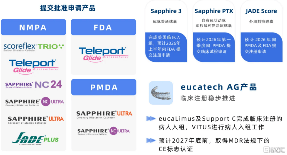 在研管线方面,公司已向(xiang)FDA、PMDA及国家药监(jian)局提交7款产(chan)品注册申请。另外,公司具(ju)有雄厚的产(chan)品管线,个中自有冠脉紫杉醇药物涂层球囊Sapphire PTX预计将于2026年第一季度向(xiang)日本(ben)PMDA递交临床(chuang)试(shi)验申请。这(zhe)些雄厚而(er)处于不同阶段(duan)的产(chan)品管线,为公司日后连续增长供应源源不断的动力。