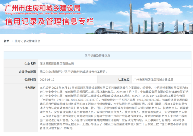 据公示(shi)内(nei)容,监管机(ji)关于2025年9月11日对深圳(chou)三图扶植集团有限公司涉嫌守法转包备案调查。经查明,中航扶植集团有限公司为纳米生物(wu)安全(quan)中心暨广(guang)纳创(chuang)新院总部园区二期工程总承包单元,2024年6月7日,中航扶植集团与深圳(chou)三图扶植集团签订了(le)该(gai)园区二期扶植工程勘察设计施工总承包(EPC)-14栋14~23层装修(xiu)工程分包条约,条约价(jia)款为1500万元。
